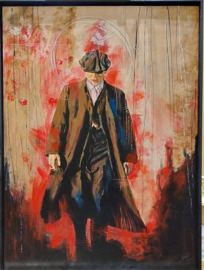 Titel Tommy on Fire Kunstenaar Rolien Schrik Omschrijving Tommy Shelby van de Peaky Blinders on fire Verf Acryl Materiaal Hout Categorie Peaky Blinders Afmetingen 73 x 98 cm